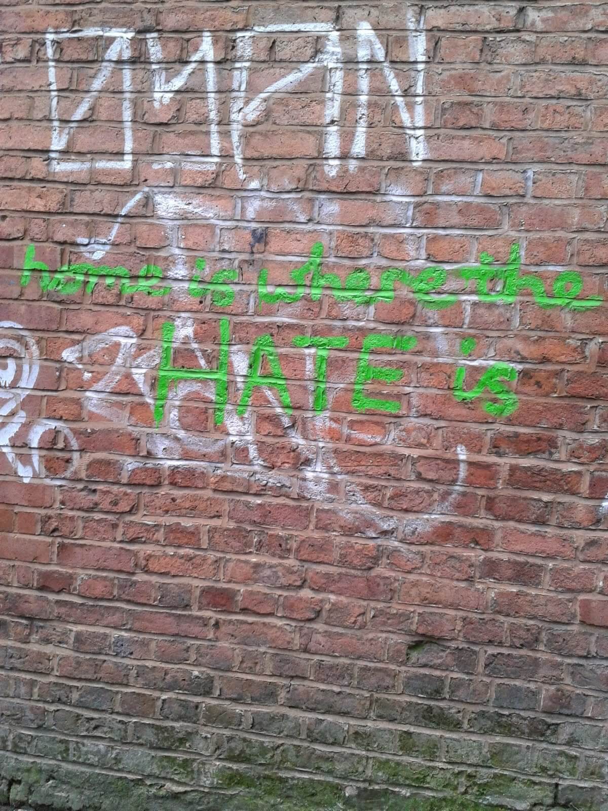 Immensely intriguing, however, were the capricious designs on the walls. One fine rainy (surprise surprise) morning, I chanced upon the words ‘Home is where the hate is’, and remained transfixed. There was a story in those words, and I wouldn’t rest until I had played out all possible scenarios. Was it a teen fed up with home? Or a homeless adult cast away?
