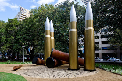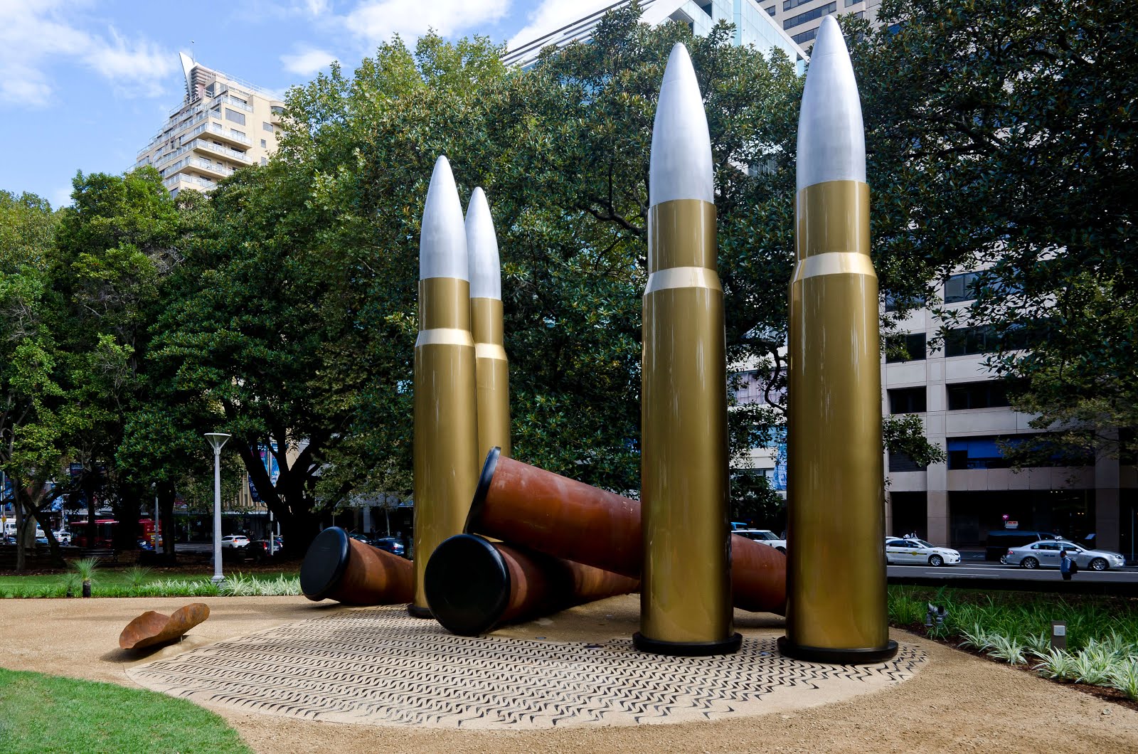 Bullets. Four of them, seven metres high, imposing in absolute rigidity. Full metal jackets. A sculpture that didn\’t toy around with ambiguity; it was clear what the bullets implied. They exuded a plaintive sentience which, while inescapable, was only a part of the full message.
